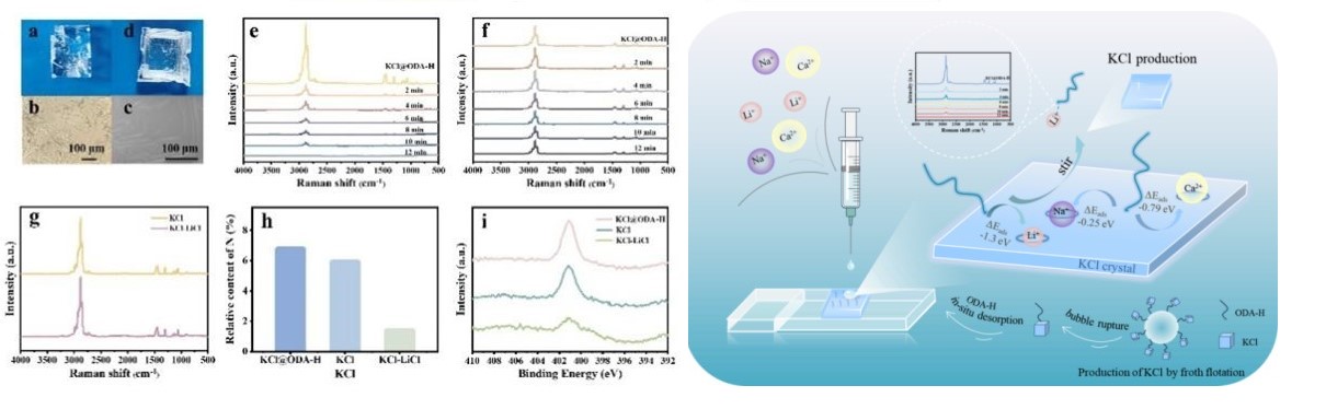 研究發(fā)現(xiàn),陽離子種類顯著影響ODA-H的脫附效果,其中Li+的促進作用最明顯。通過原位拉曼光譜驗證,明確了脫附效果由Li+的主動作用驅(qū)動導(dǎo)致,且該策略在酸性、中性體系中均能穩(wěn)定起效。DFT計算結(jié)果表明,Li+可嵌入KCl晶格結(jié)構(gòu)中,引發(fā)KCl表面的局部晶格形變,減弱了ODA-H與KCl表面的結(jié)合力;同時,Li+對ODA-H具有強吸附作用,可定向驅(qū)動ODA-H脫離KCl固體表面,最終實現(xiàn)高鹽體系下的高效原位去除。