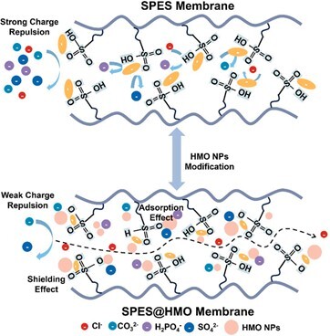 針對(duì)上述挑戰(zhàn),中國(guó)科學(xué)院青海鹽湖研究所離子吸附科學(xué)與技術(shù)課題組提出了一種氯離子膜“電荷屏蔽效應(yīng)”設(shè)計(jì)策略,開發(fā)了一種由磺化聚醚砜(SPES)與水合錳氧化物(HMO)顆粒復(fù)合的新型混合基質(zhì)膜-氯離子吸附膜(SPES@HMO)。該膜利用HMO納米顆粒調(diào)控膜界面電荷環(huán)境,從而特異性增強(qiáng)氯離子的傳輸,同時(shí)結(jié)合競(jìng)爭(zhēng)吸附機(jī)制抑制多價(jià)陰離子的通過,為高鹽廢水中氯離子的高精度篩分提供了全新解決方案。